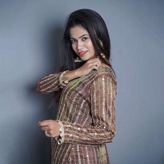Embellished brown Kurta Set with Aqua Palazzo and Dupatta