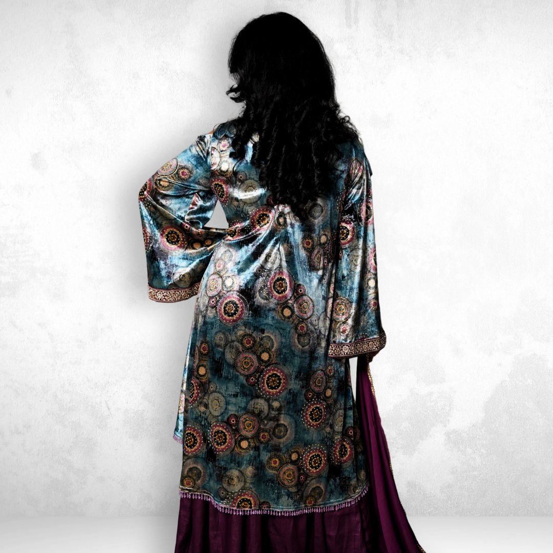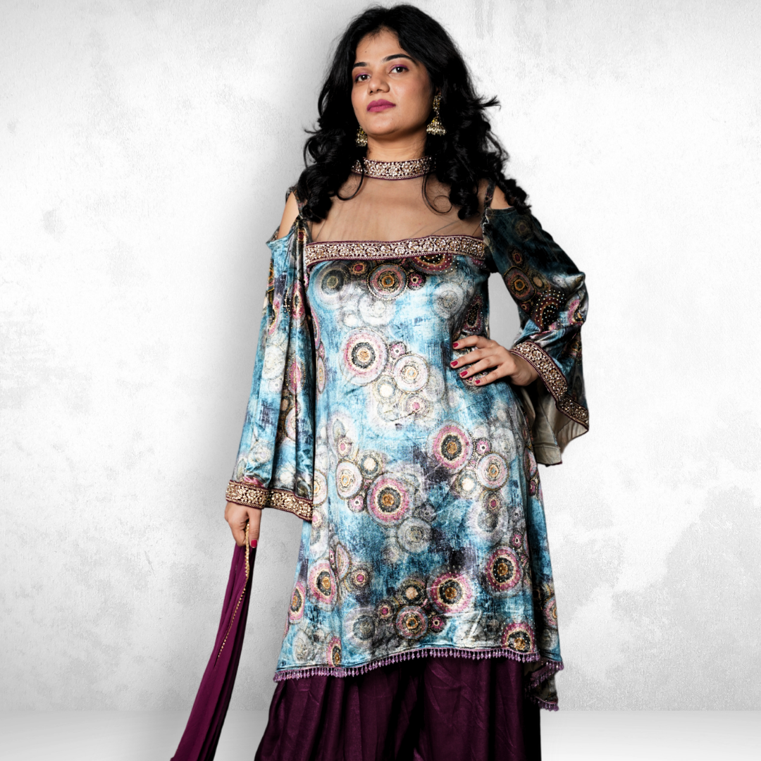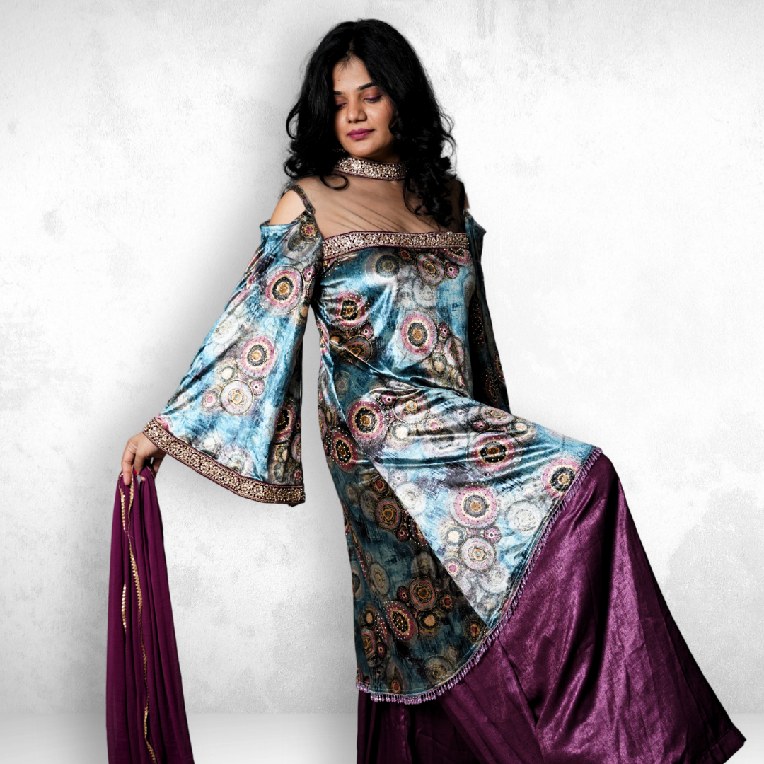 Black and wine color neck with black net with handwork on bottom with full flare plazzo chiffon dupatta