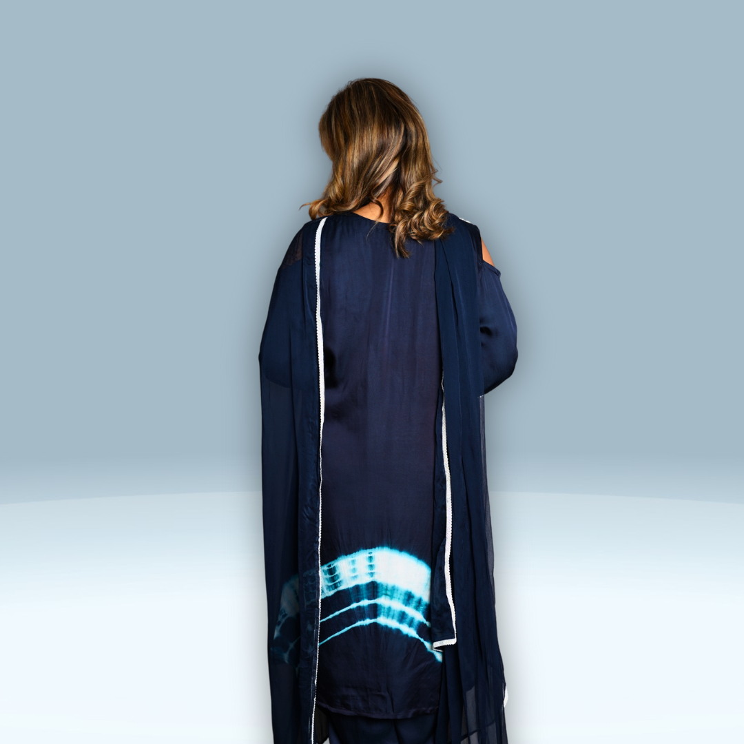 Deep blue shibori with complete pearl handwork and cutdana handwork high and low style with straight pant georgette dupatta lacing all over