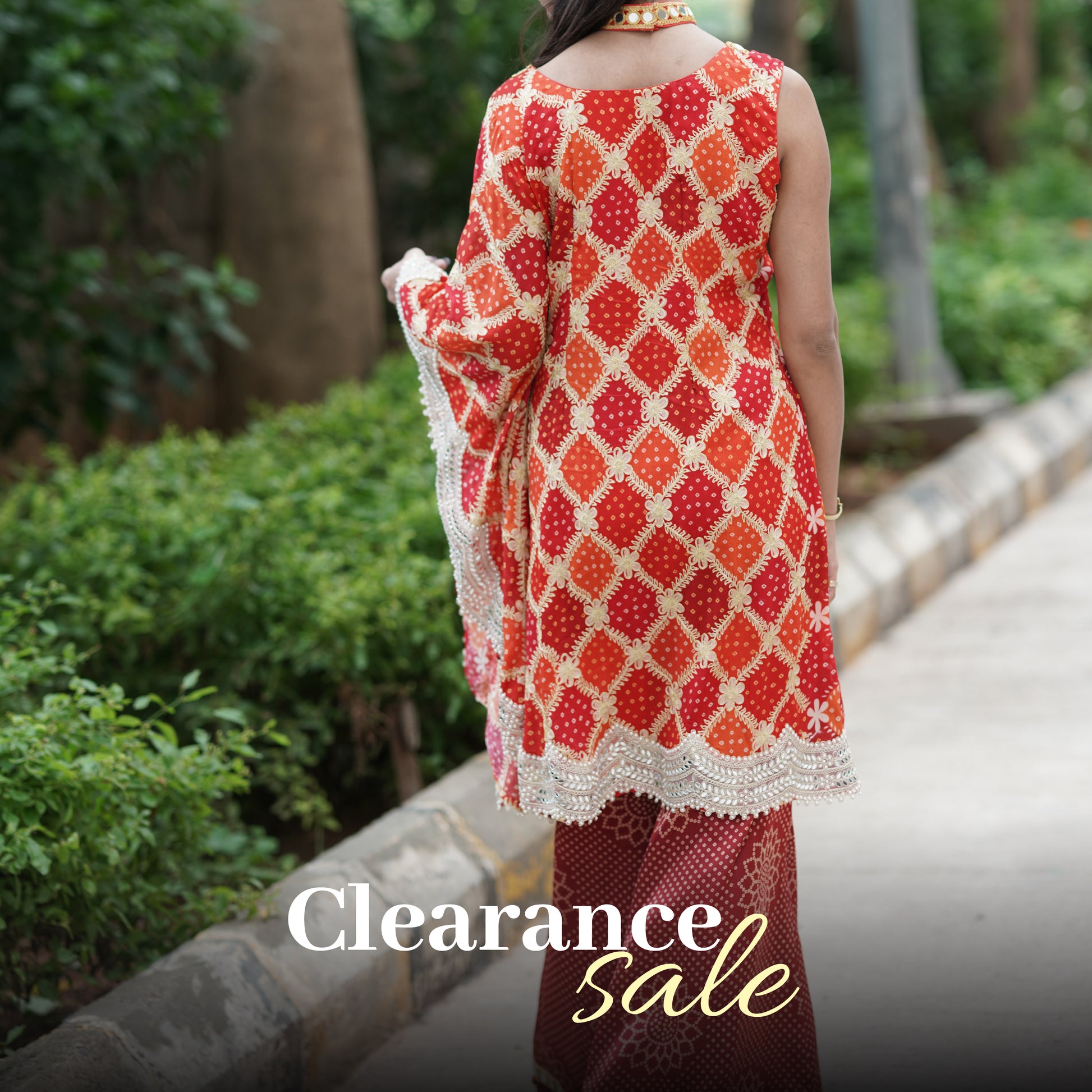 Beautiful combination of red and orange one side kaftan and onebside sleeveless with bandhej modal silk bell bottoms with georgette laheriya dupatta
