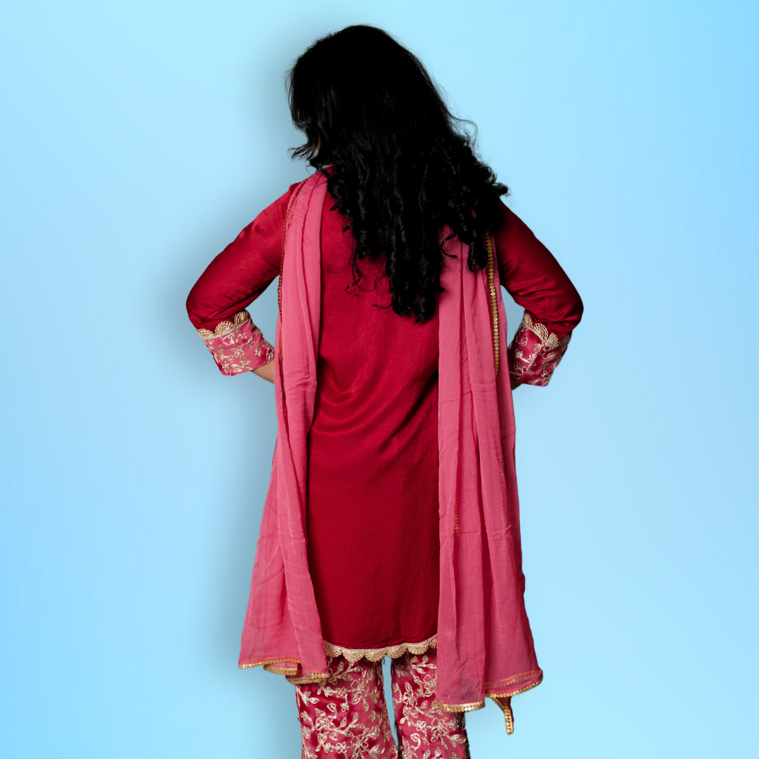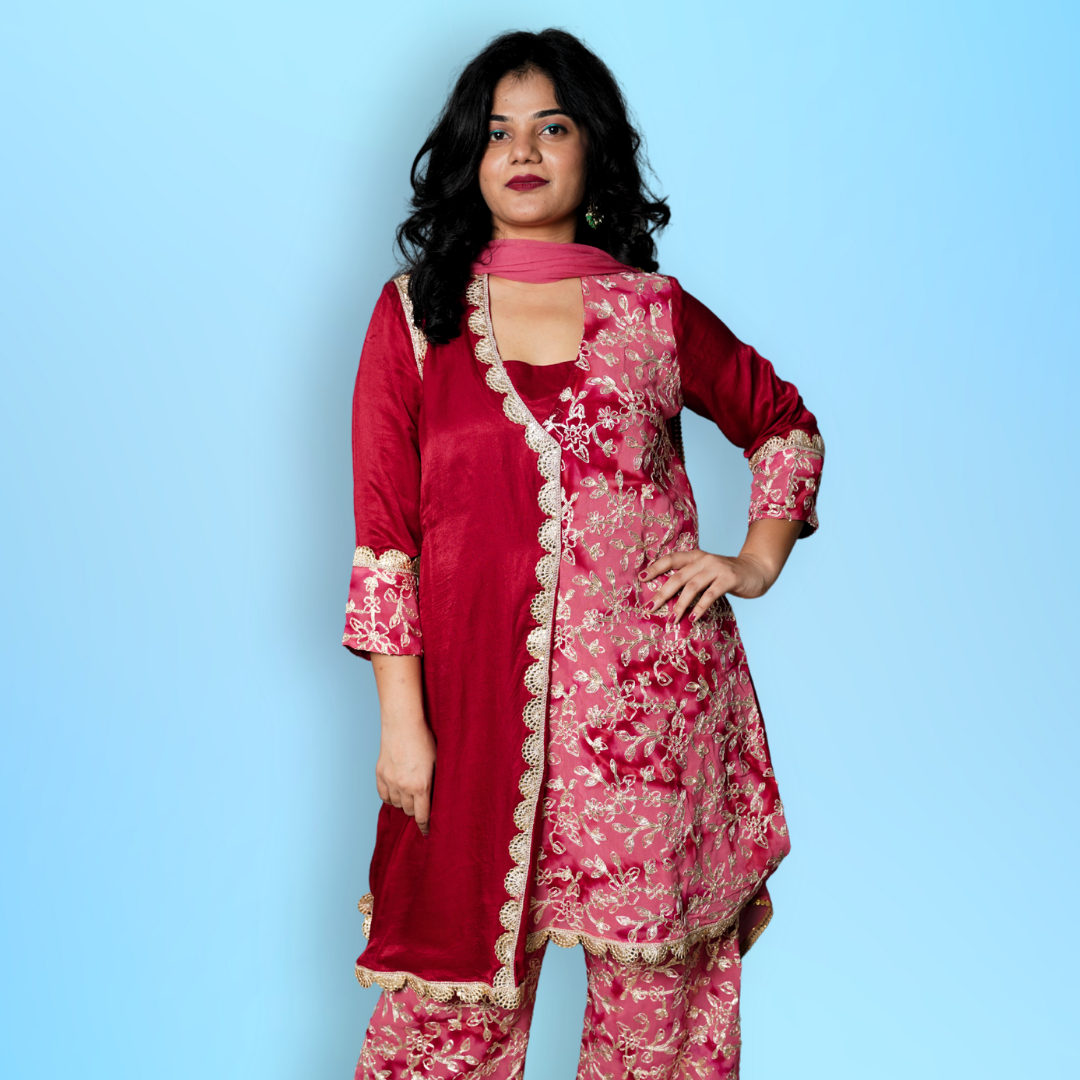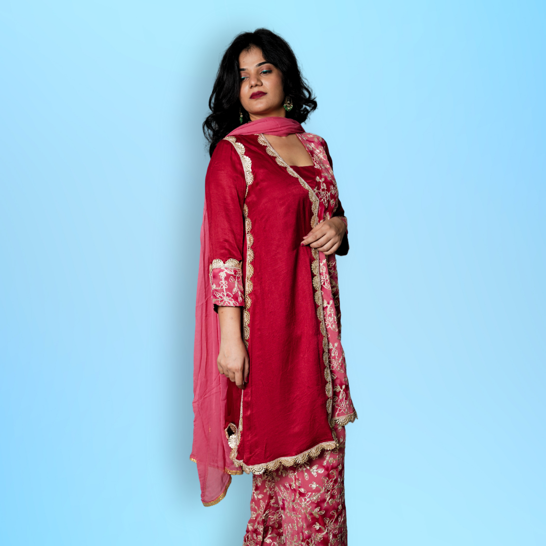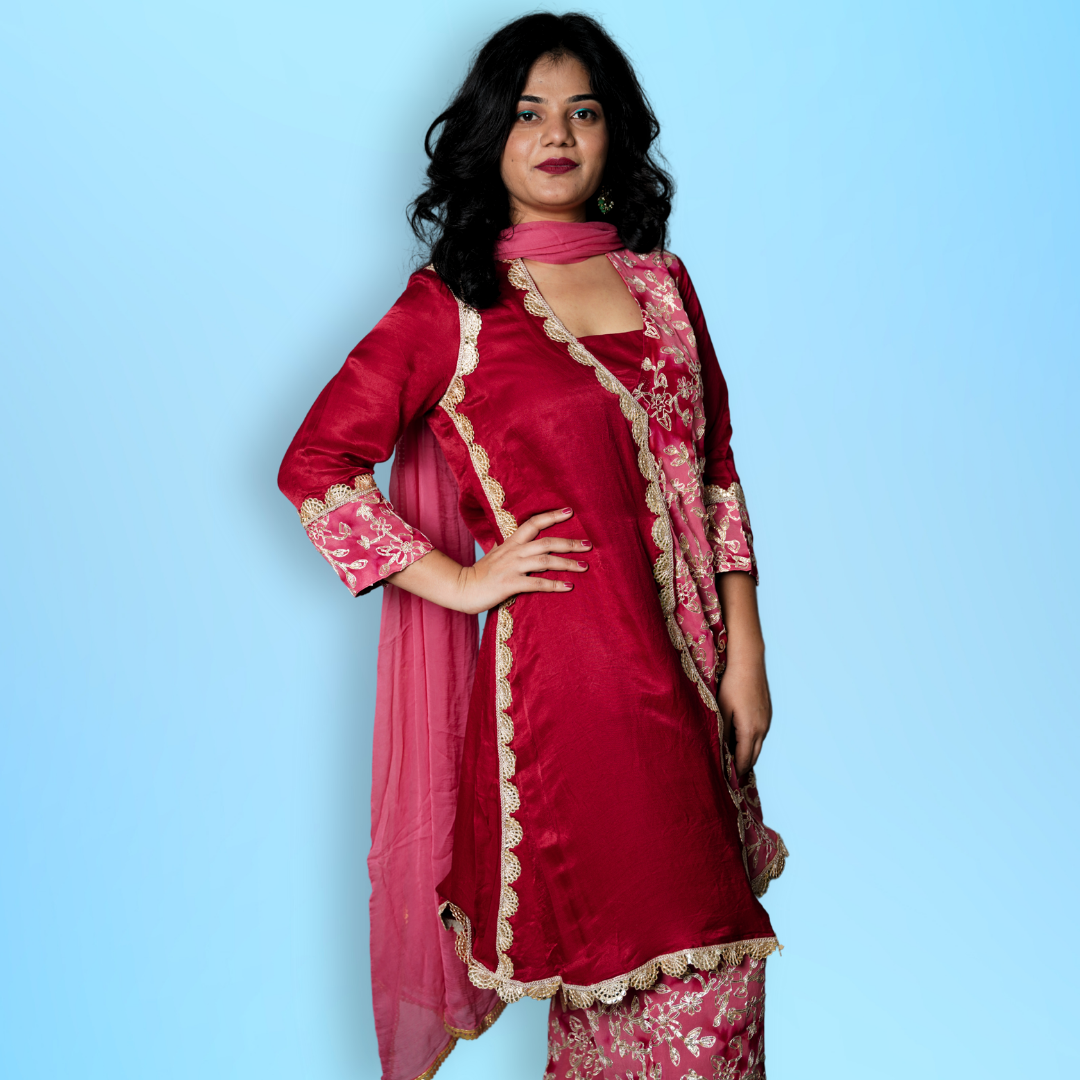Half and half red and pink combination with half plain with lacing and half gota patti work pants gota patti plazzo with georgette dupatta lacing all over