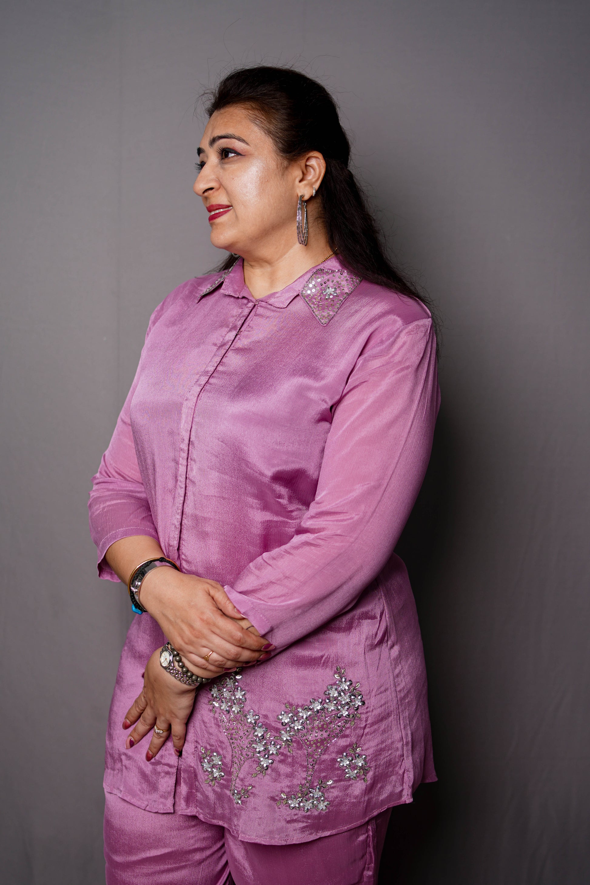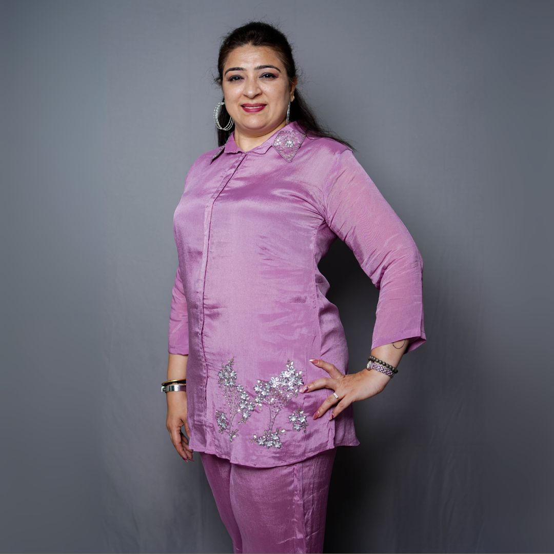 The collared kurta features delicate sequin floral embroidery on the hem and collar, adding a touch of sparkle without overpowering the look. Paired with matching tapered pants, this cord set is perfect for semi-formal occasions, festive gatherings, or elevated daywear.