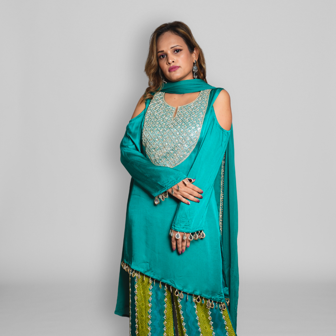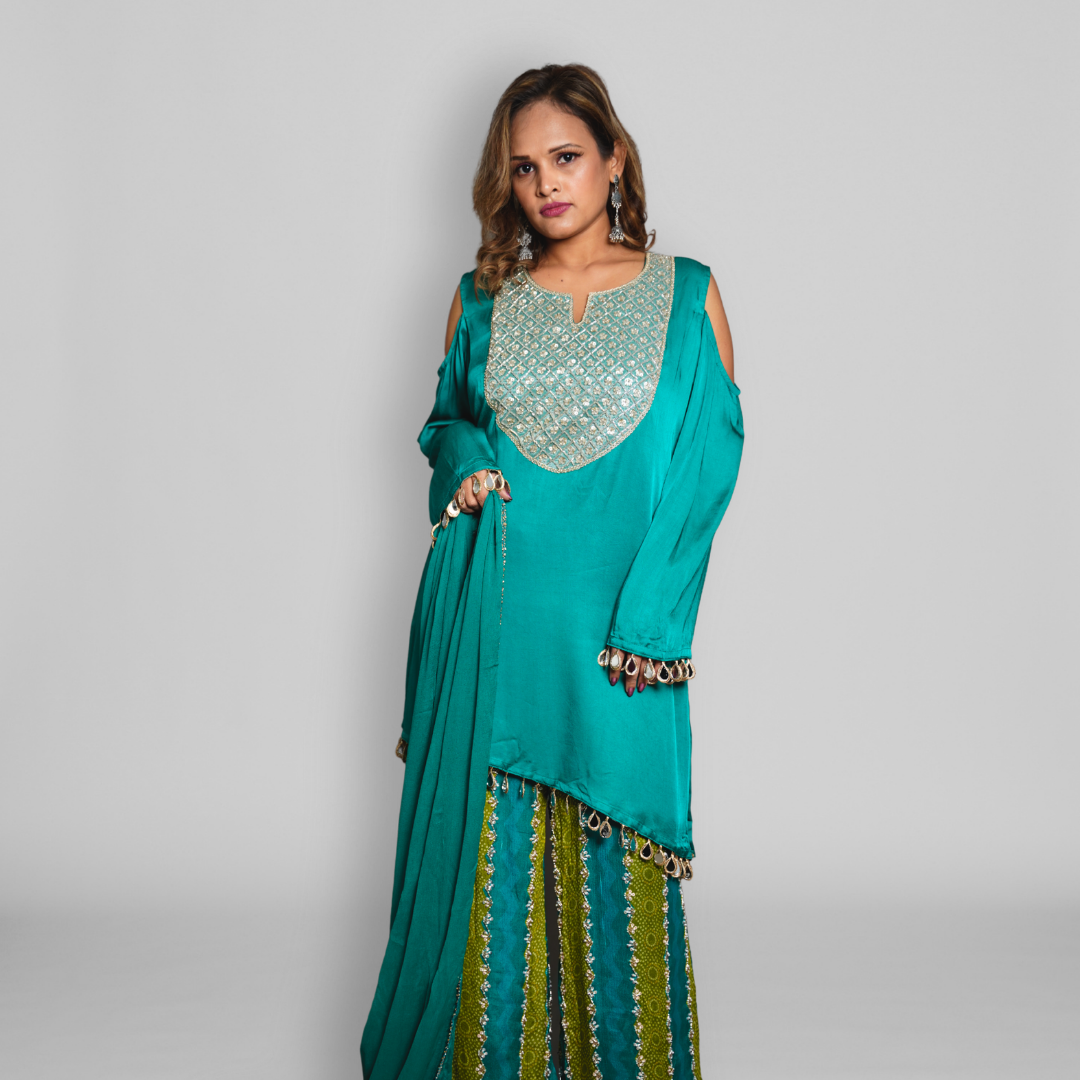 Green top with patchwork foil mirror latkans on sleeves and top bottom a symetrical style botto.M full flare plazzo in georgette and bandhani print with handwork georgette dupatta lacing all over