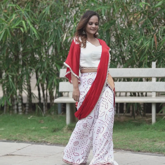 White bandhini with beautiful red shibori blouse with latkan at back plazzo with attached beautiful red saree