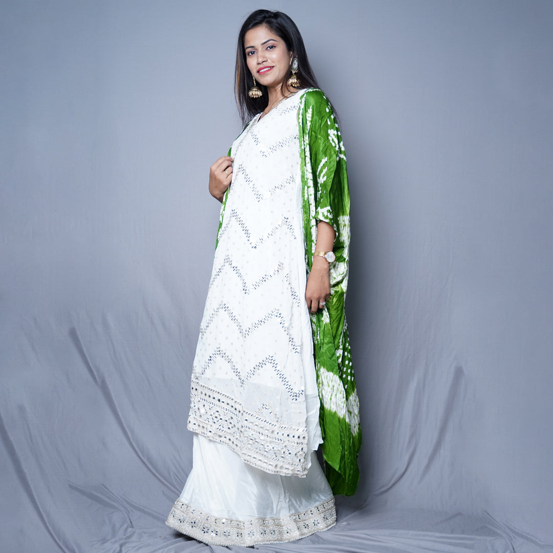 A woman is elegantly dressed in a white embroidered kurta paired with white palazzo pants adorned with intricate lace detailing. The look is elevated with a striking green tie-dye jacket, featuring classic Indian patterns.